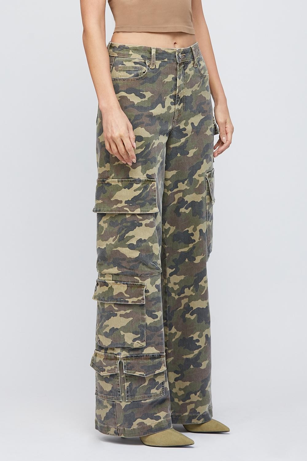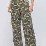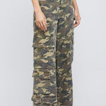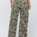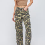 High-rise cargo pants designed to make a statement. This camo style combines practical functionality with bold fashion appeal, featuring multiple pockets and a flattering elevated waistline. Perfect for those who want to stand out while enjoying the comfort and utility of cargo styling. Versatile enough to dress up or down, these pants support your personal style with confidence.