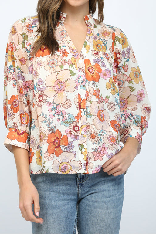 Elevate your everyday style with this charming ruffled high neck button down blouse. The delicate ruffle detailing at the neckline adds a touch of sophistication, while the three-quarter length sleeves offer versatile layering options. Classic button-front closure makes it easy to dress up or down. Perfect for the office, weekend outings, or casual gatherings. A timeless piece that transitions seamlessly from season to season.