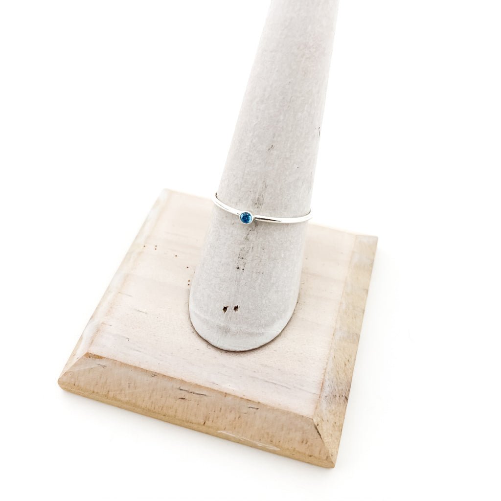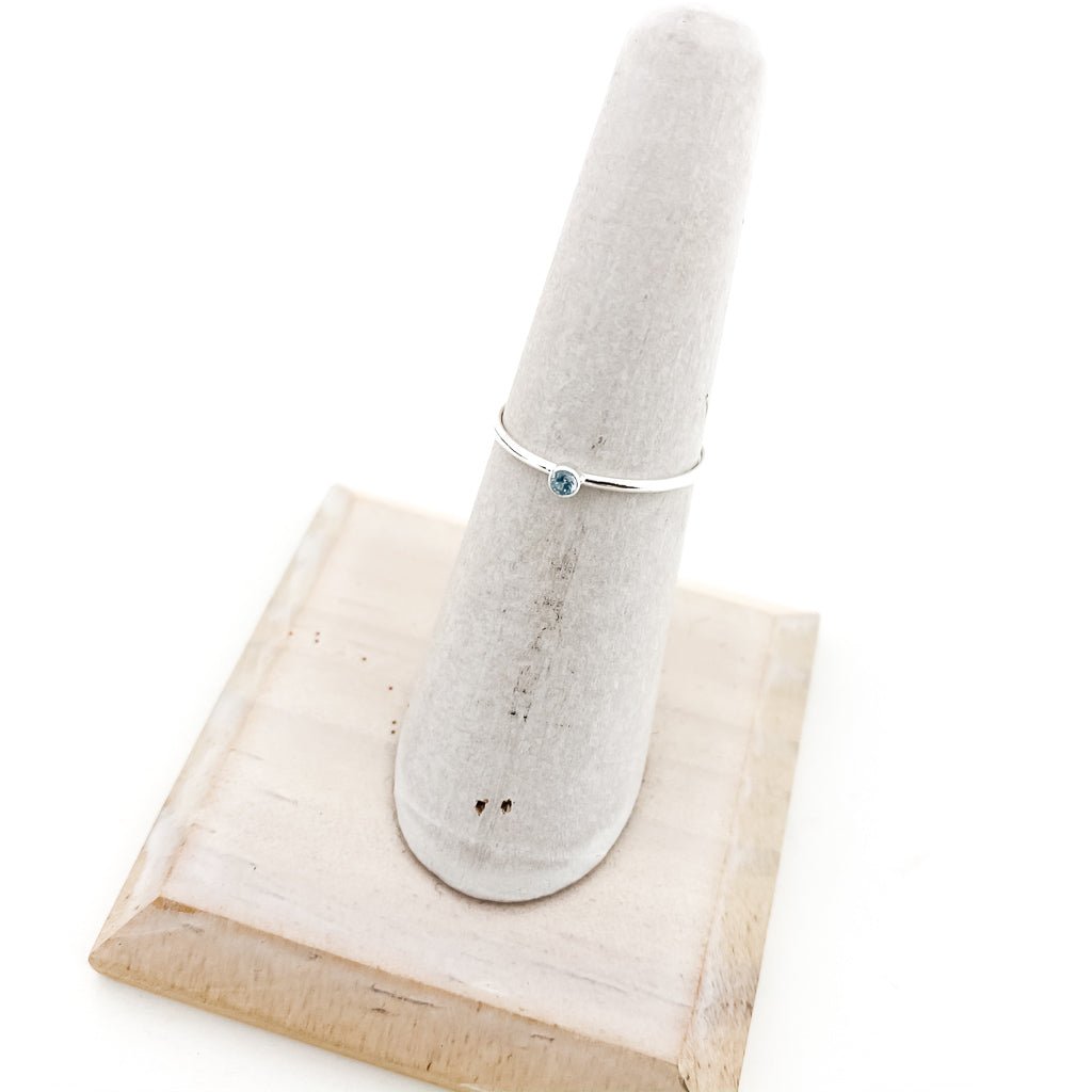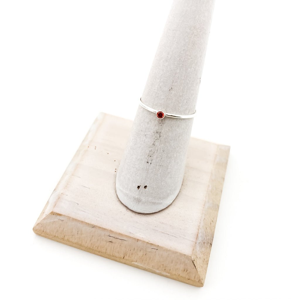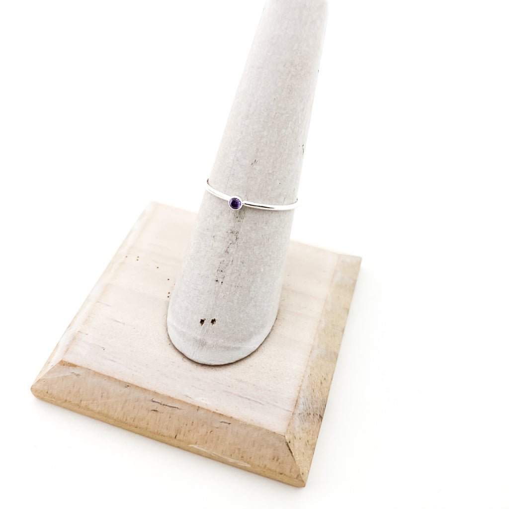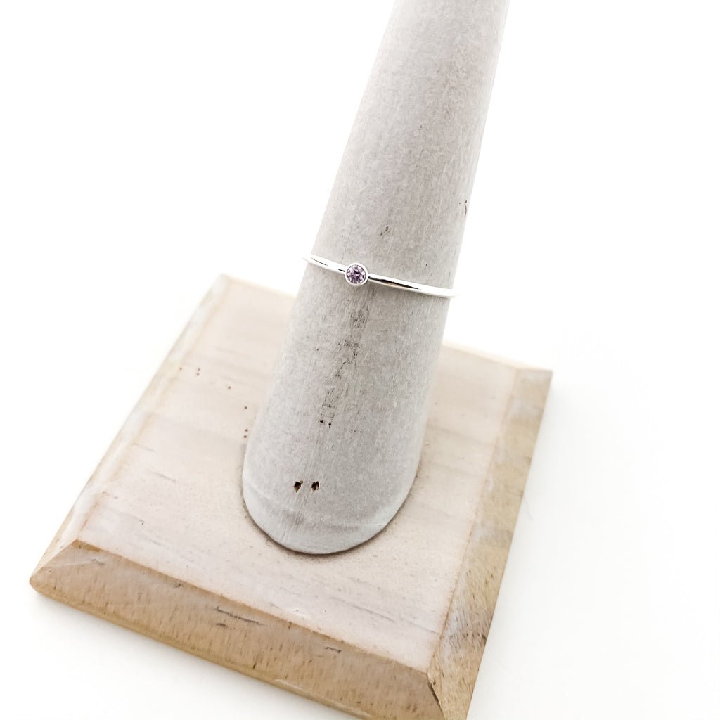 Elevate your everyday style with our Bella Birthstone Stacking Ring in sterling silver. This delicate 1mm ring showcases a shimmering 2mm round birthstone, perfect for stacking or wearing solo. Choose your own birthstone or stack multiple rings to represent each of your children.