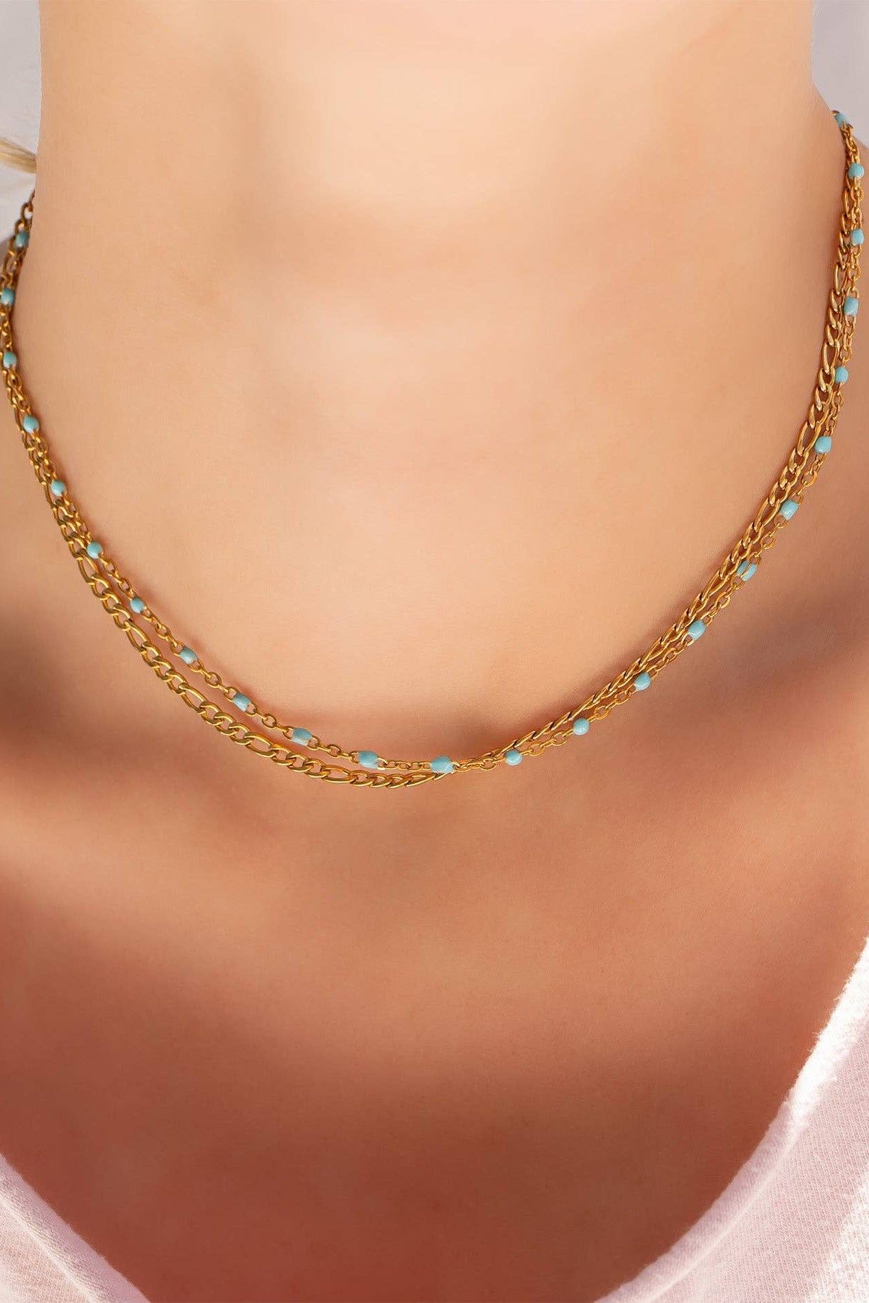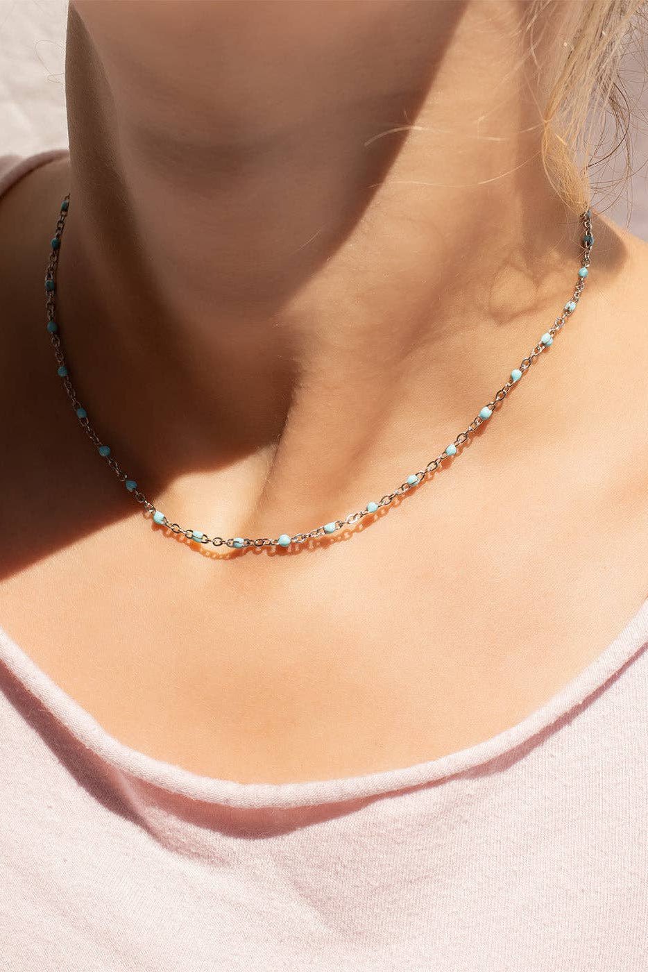 This 18K gold stainless steel necklace features vibrant turquoise beads that add a fresh pop of color. Made with a durable, tarnish-resistant finish, it’s waterproof and hypoallergenic for everyday comfort. Adjustable in length with a secure clasp, it’s perfect for layering or wearing alone. Pair it with the matching bracelet for a complete look.