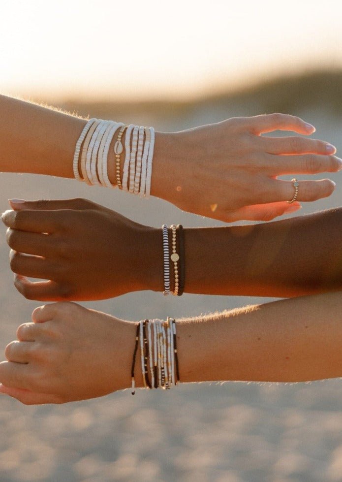 Add a splash of cool to your look with the Seascape Vinyl Disc Stretch Bracelet. Its sleek black discs and shiny silver-plated brass logo bead bring a playful edge to any outfit. Stretchy and comfy with a 6.5" fit, it’s ready to keep up with your adventures while turning heads wherever you go.
