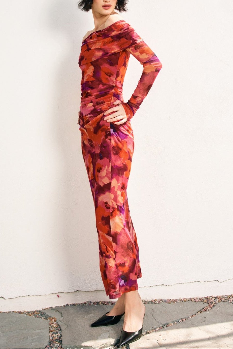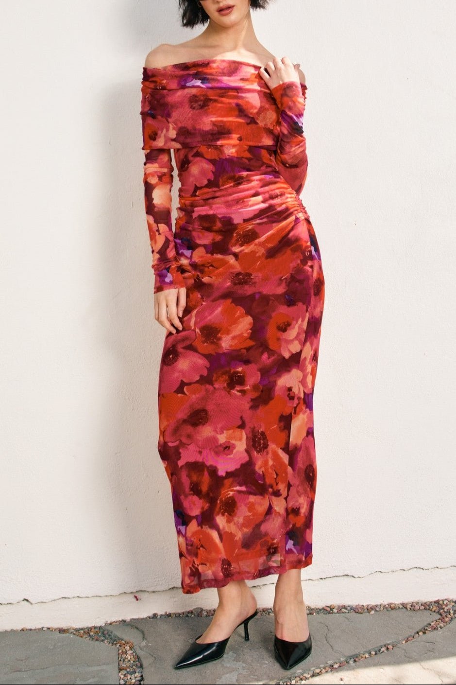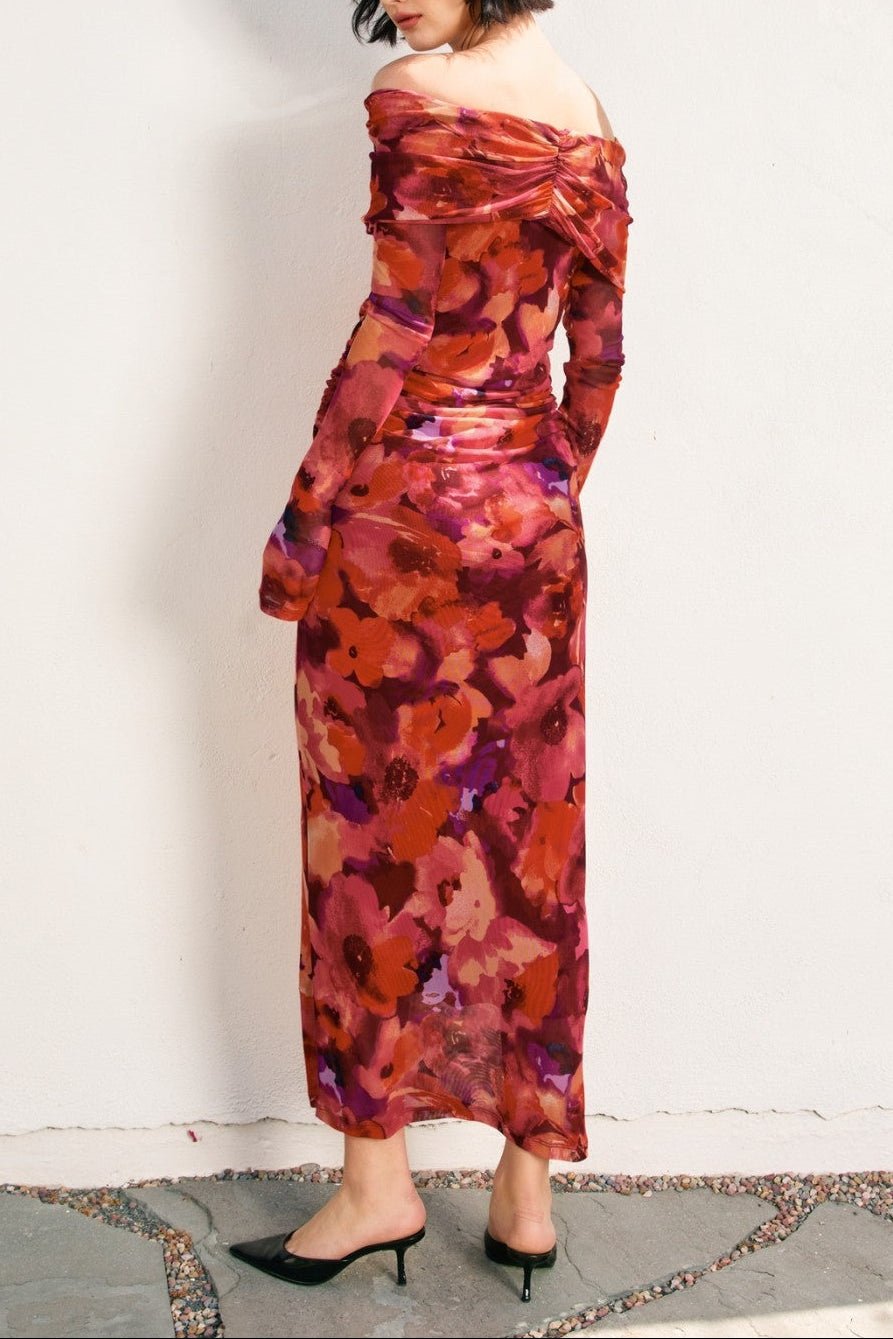 Make an unforgettable entrance in The Sienna Off-Shoulder Mesh Midi Dress — a figure-flattering statement piece that blends bold color with timeless femininity. The vibrant floral print in rich reds, pinks, and purples creates a romantic yet confident vibe, while the foldover off-the-shoulder neckline adds just the right touch of sophistication.
