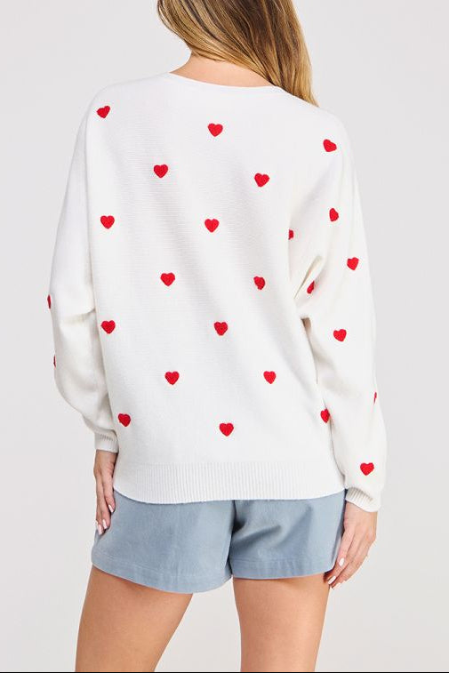Wrap yourself in cozy comfort with this beautifully crafted dolman sweater. The soft fine gauge knit drapes effortlessly across your shoulders, while dimensional 3D textured hearts add a charming pop of visual interest. Contrast detailing elevates the design, making it perfect for layering or wearing solo. Whether you're heading out for the day or settling in at home, this versatile piece brings warmth and style together in one flattering silhouette. A wardrobe essential that celebrates both comfort and character.