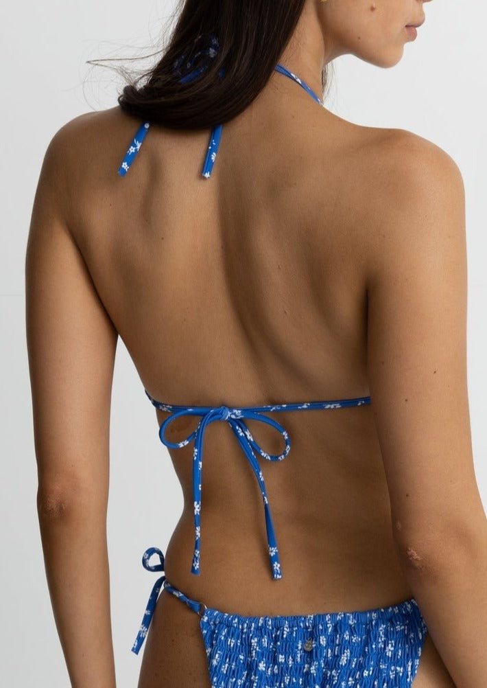Indulge in sunny days with the Elodie Floral Smocked Slide Tri-Top. With its eco-friendly smocked texture and tie-string halter neck, this top offers both comfort and style. Featuring a ditsy floral print and adjustable underbust, it's perfect for A-C cups. The Elodie also includes removable padding and a metal coin logo. Made with 82% recycled polyamide and 18% elastane for the main fabric and 80% recycled polyamide and 20% elastane for the lining.