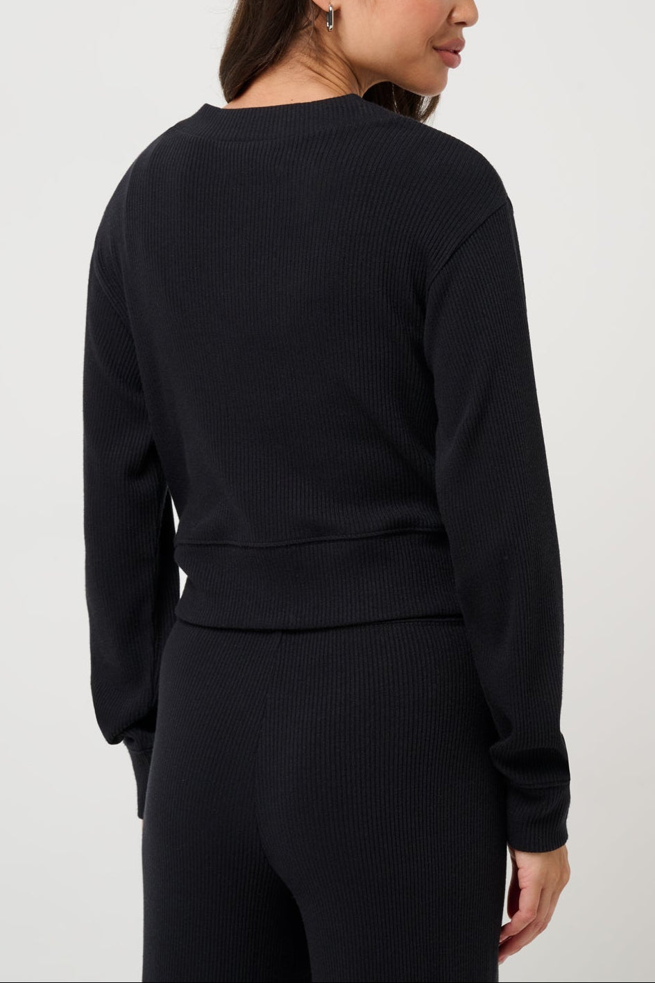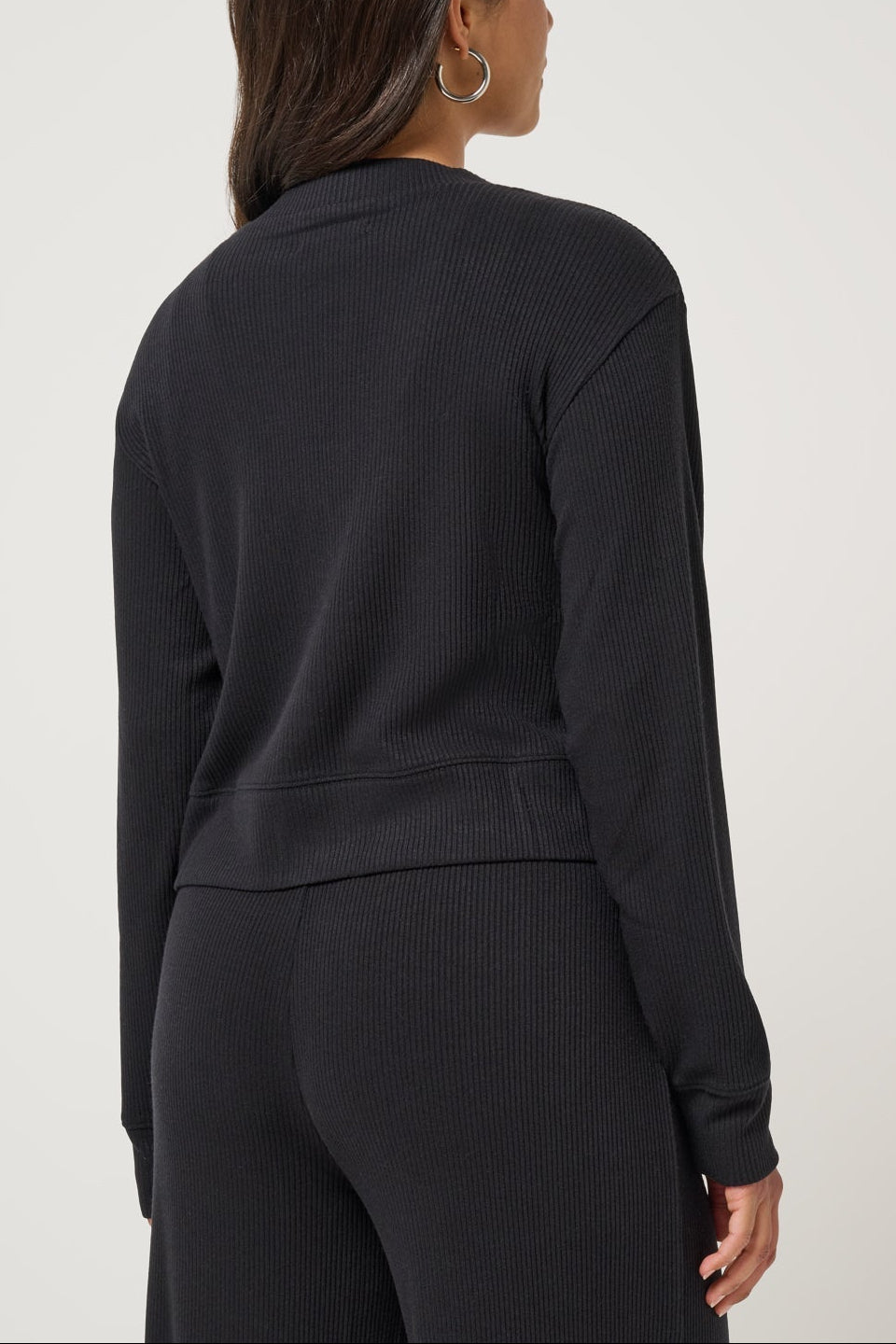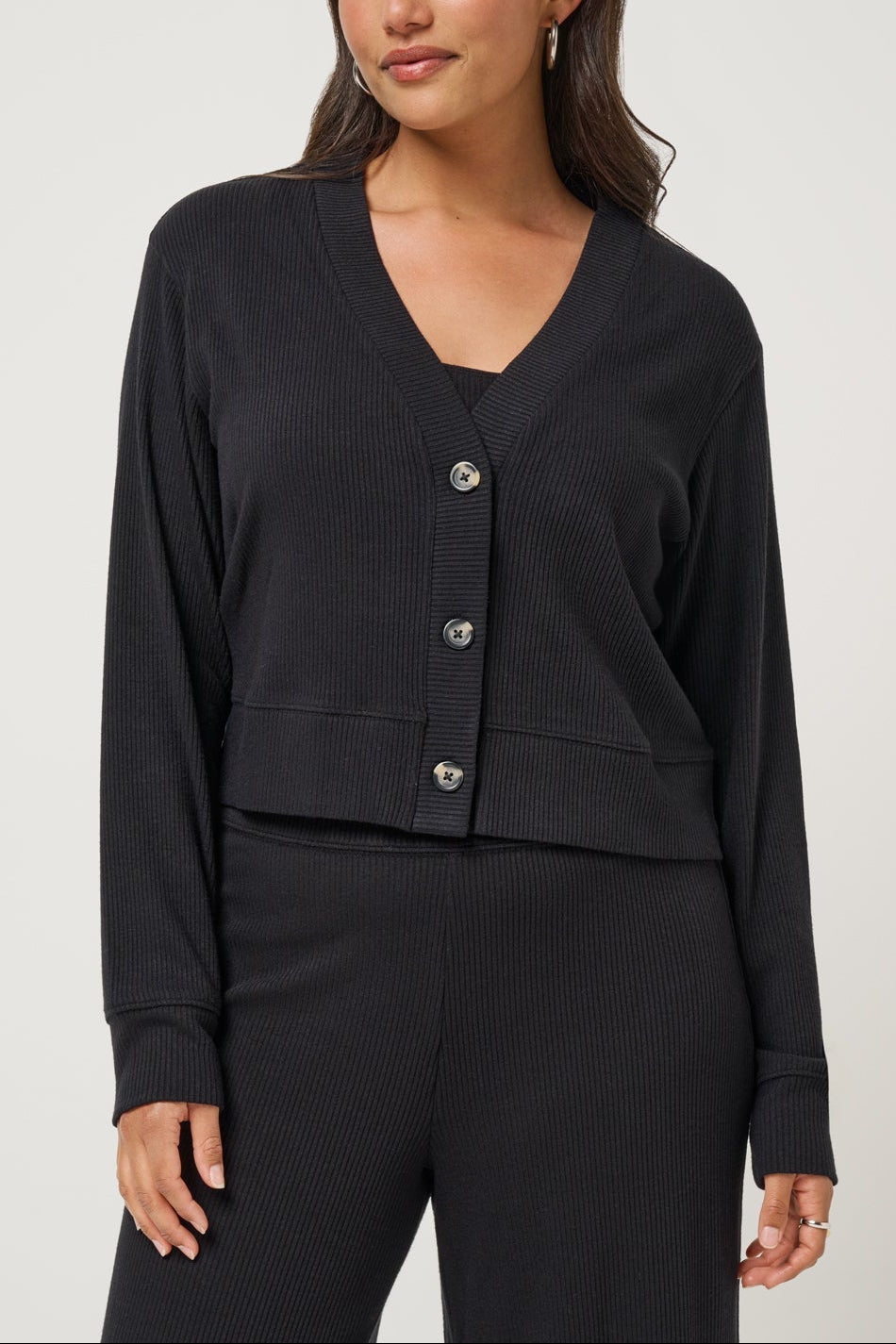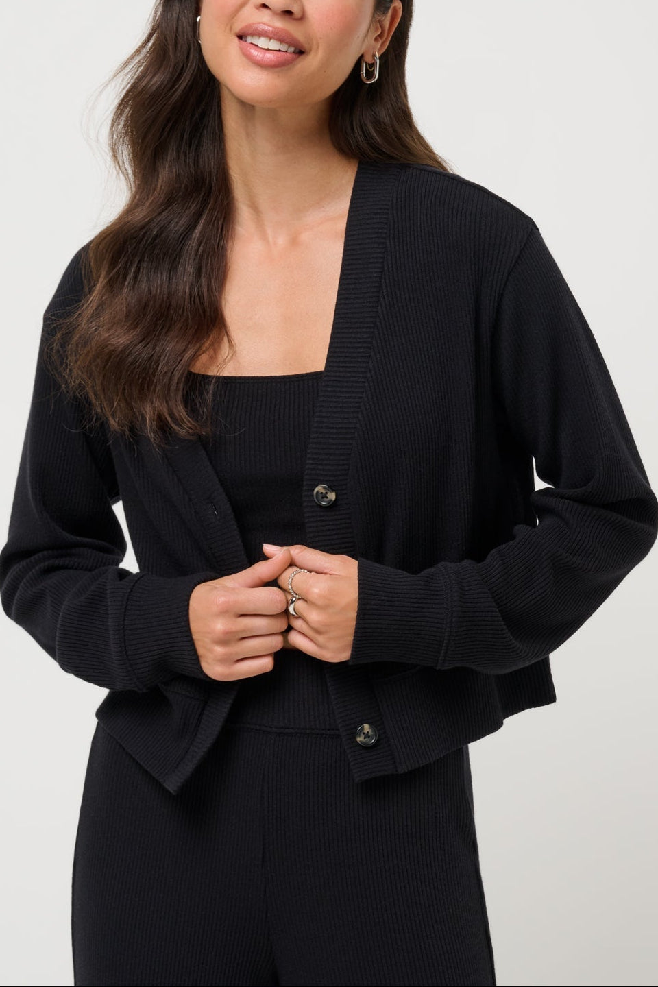 The sweater that feels like a hug. EVENING RETREAT CARDIGAN is made from our bestselling wide gauge rib with a slightly updated silhouette for an even softer take on a cozy classic. Featuring a relaxed fit, drop shoulder, and button-down front with a flattering V-neckline, it’s the perfect throw-on-and-go layer. Wear it with the Evening Retreat Tank and Pant for the full feel-good fit.