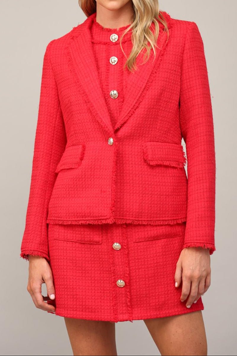 Elevate your everyday style with this charming Samara Fray Detail Tweed Blazer Jacket. The delicate frayed edges add a playful, modern twist to a timeless classic, creating an effortlessly chic silhouette. Layer it over your favorite blouse and pair with dark or light jeans for a look that transitions seamlessly from office to weekend brunch. Perfect for anyone seeking that cute, put-together aesthetic without sacrificing comfort or versatility.