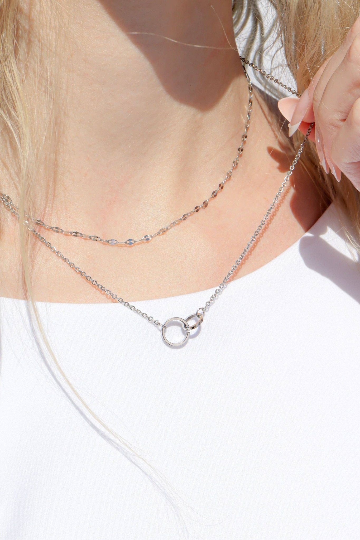 This elegant necklace features two interlocked rings symbolizing unity and love. Made from waterproof, hypoallergenic stainless steel with a 16" chain plus 2" extension, it offers lasting wear without tarnishing. Available in stainless steel or 18K Gold PVD, it’s a refined choice for special occasions like engagements and Mother’s Day.