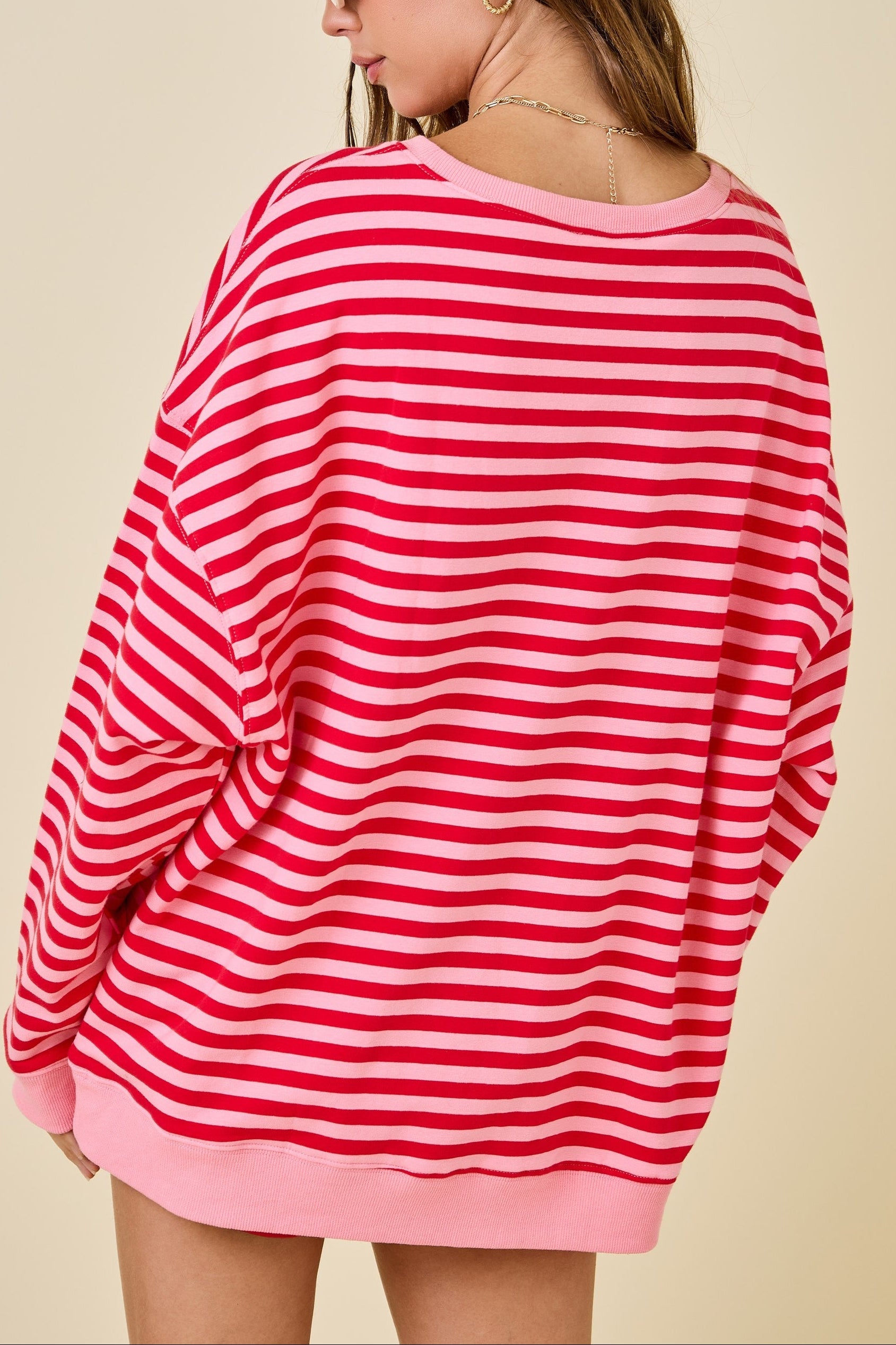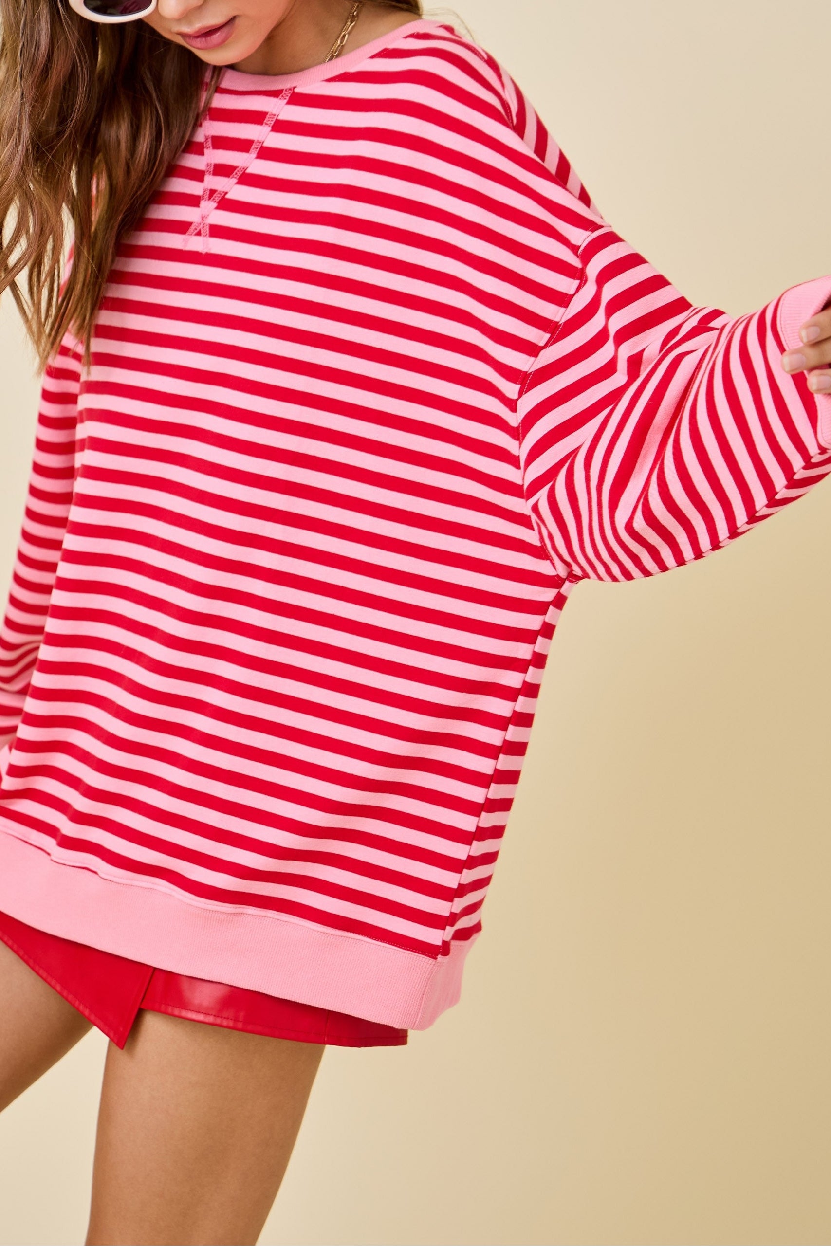 The bold stripe pattern makes a statement, while the contrasting ribbed trim at the neckline, cuffs, and hem keeps it feeling polished. The drop shoulders and relaxed silhouette give it that laid-back, borrowed-from-the-boys feel — but the drape keeps it flattering.
