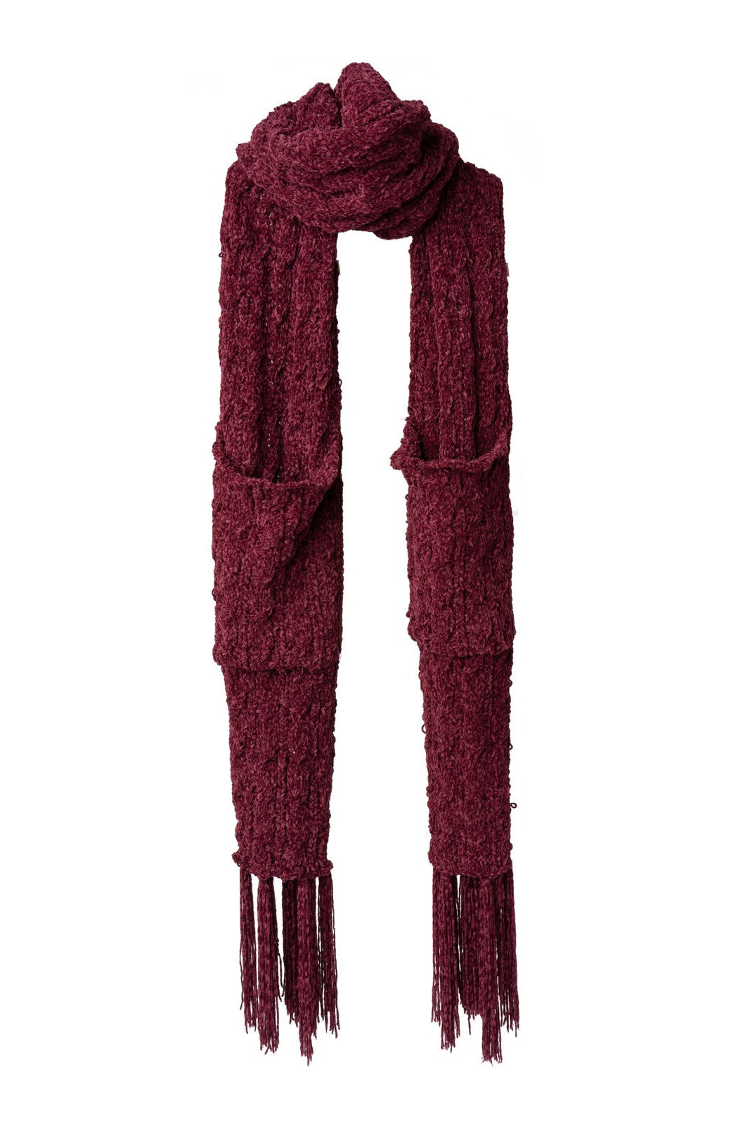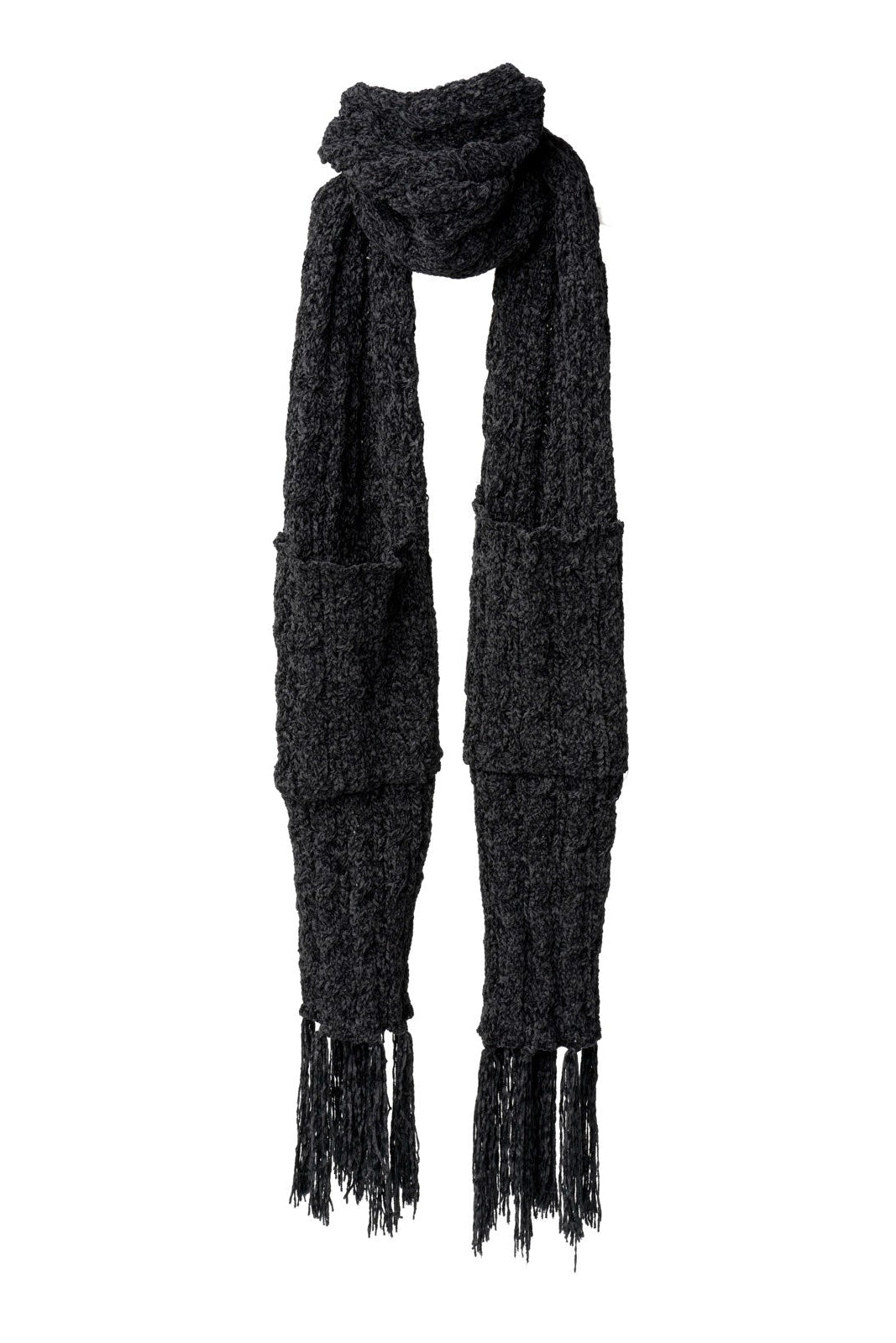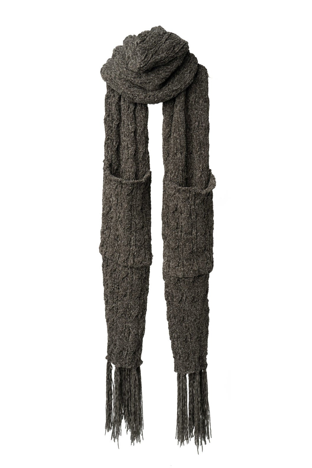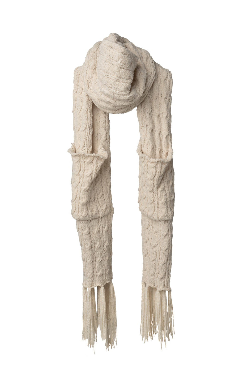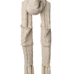Wrap yourself in luxurious comfort with this cable knit scarf crafted from impossibly soft chenille. Designed with practical hand pockets built right in, it keeps your hands warm without sacrificing style. Finished with charming knotted fringe details, this piece effortlessly transitions from casual outings to cozy evenings. The perfect blend of functionality and timeless elegance for anyone seeking warmth with a touch of sophistication.