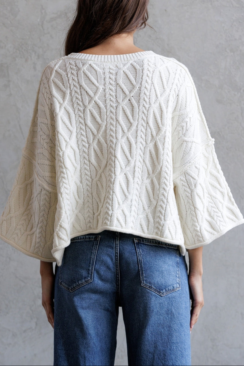 The Camryn Cable Knit Cropped Sweater features a rich cream color that beautifully highlights the textured knit design. Its relaxed, boxy fit with a slightly cropped length offers comfort and effortless style. The crew neckline is accented with ribbed detailing for added structure, while wide bell sleeves add a unique, flattering touch. Perfect for layering or wearing on its own, this pullover sweater combines cozy warmth with a fashionable silhouette.