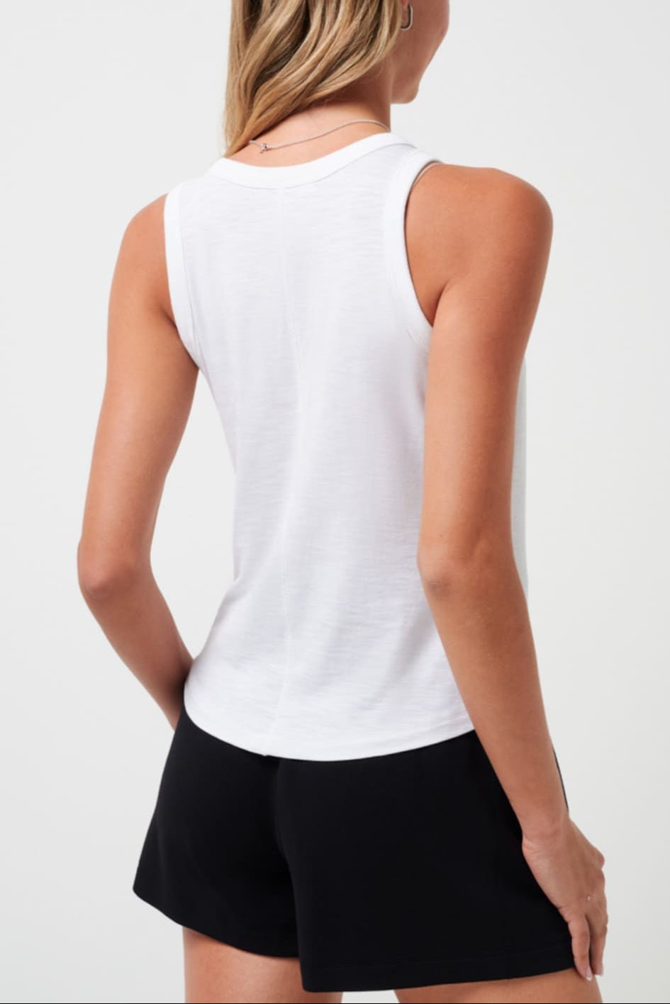 The Cloud Tank 2.0 combines effortless style with exceptional comfort. Crafted from a lightweight tri-blend jersey, it offers a perfect balance of stretch and structure to maintain its shape throughout the day. Featuring a high neck, classic fit, and refined rib binding around the neckline and armholes, this tank’s racerback design and delicate scoop hemline provide versatile elegance for any occasion. Whether layered or worn alone, it’s a sophisticated essential that adapts seamlessly to your wardrobe.