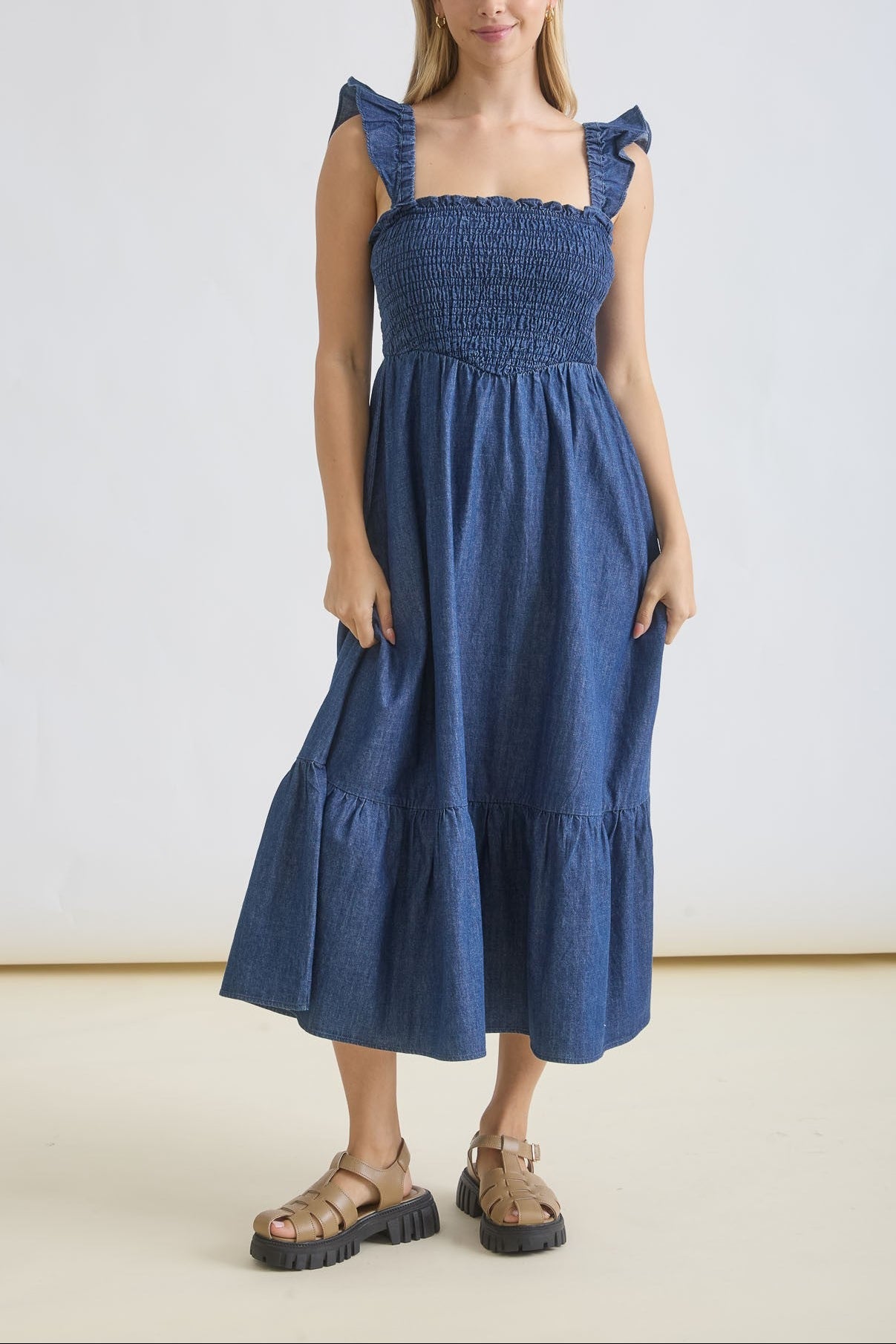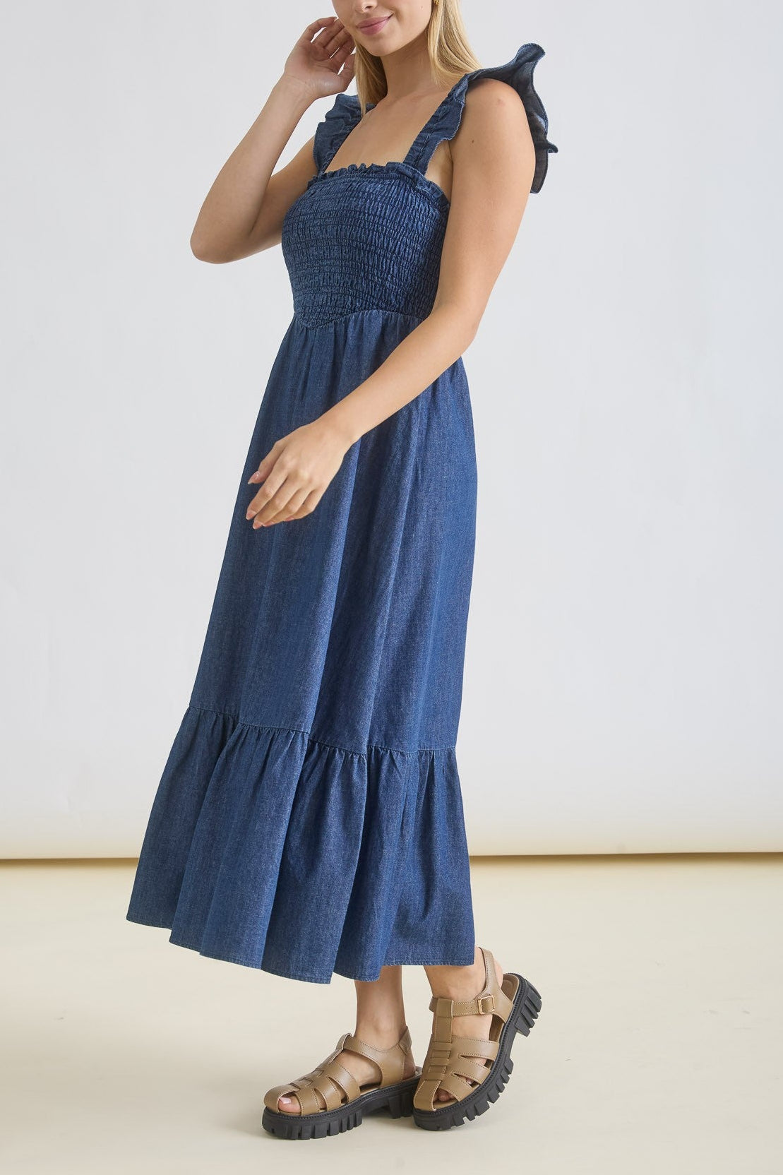 Dark Denim Ruffle Strap Midi Dress