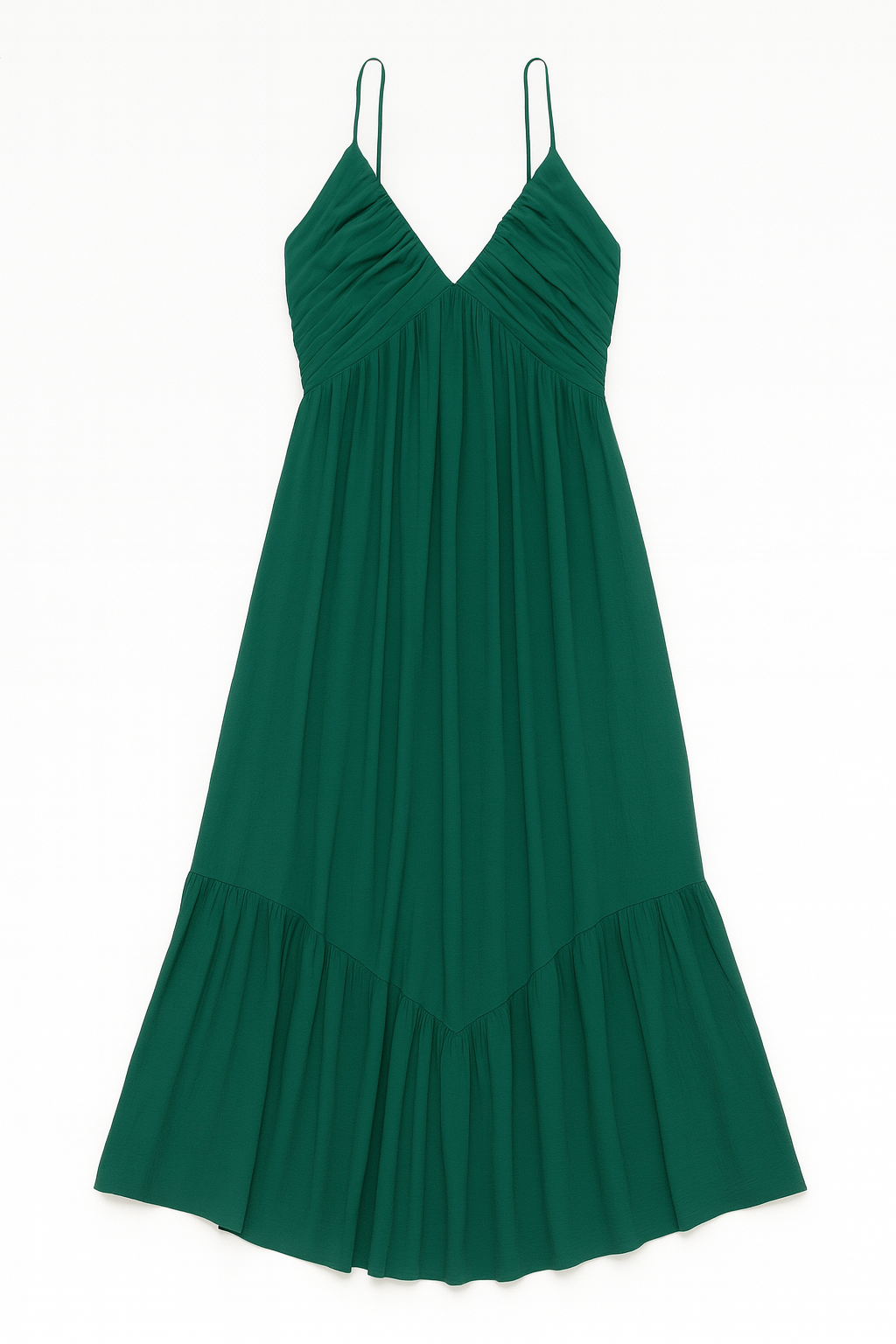 The Emmalyn Flowy Dress embodies effortless elegance with its lightweight, airy woven fabric and soft crinkled texture. It features a relaxed, flowy silhouette highlighted by a gathered ruffle hem and a ruched bodice with a flattering V neckline. Adjustable skinny straps form a sophisticated crisscross back detail, complemented by an invisible side zipper for a smooth finish. Fully lined for comfort, this dress is the perfect choice for your next evening out.