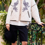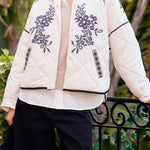 Discover effortless sophistication with the Fabiola Embroidered Quilted Jacket. This cream quilted piece showcases stunning black floral embroidery across the front, back, sleeves, and pockets, delivering an artisanal aesthetic that elevates any wardrobe. The relaxed fit and dropped shoulders provide all-day comfort without compromising on style, while black piping accents and a convenient zip front closure complete the refined look. Perfect for layering through fall and winter, this versatile jacket seamlessly transitions from casual outings to elevated occasions. Experience the perfect balance of warmth, comfort, and contemporary design.