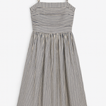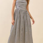The gathered midi-length skirt flows beautifully with every step and even features hidden side pockets (because we know busy moms need their essentials close by). Navy and white stripes give it a timeless coastal vibe that feels fresh for spring, summer, and even early fall.