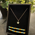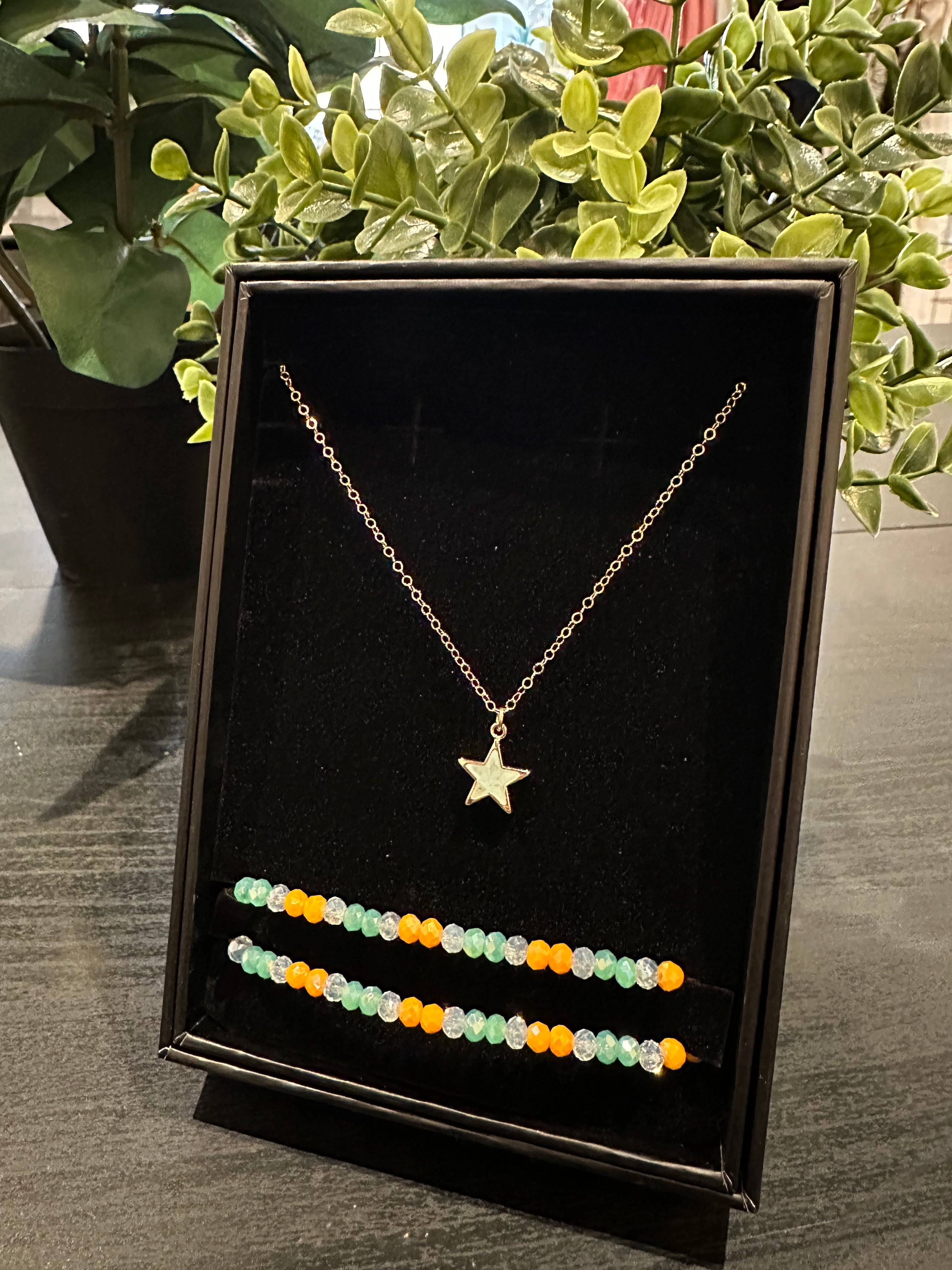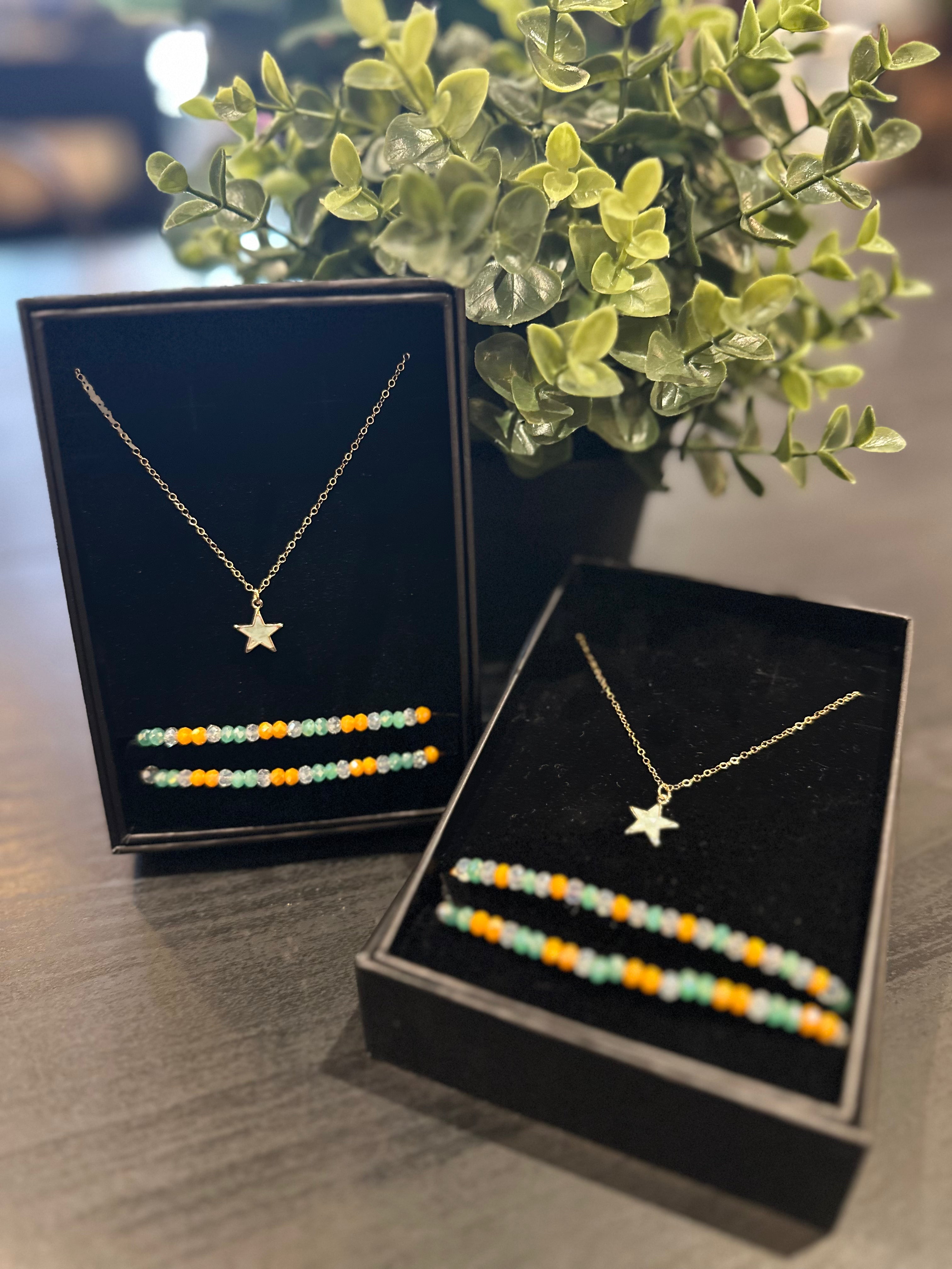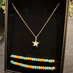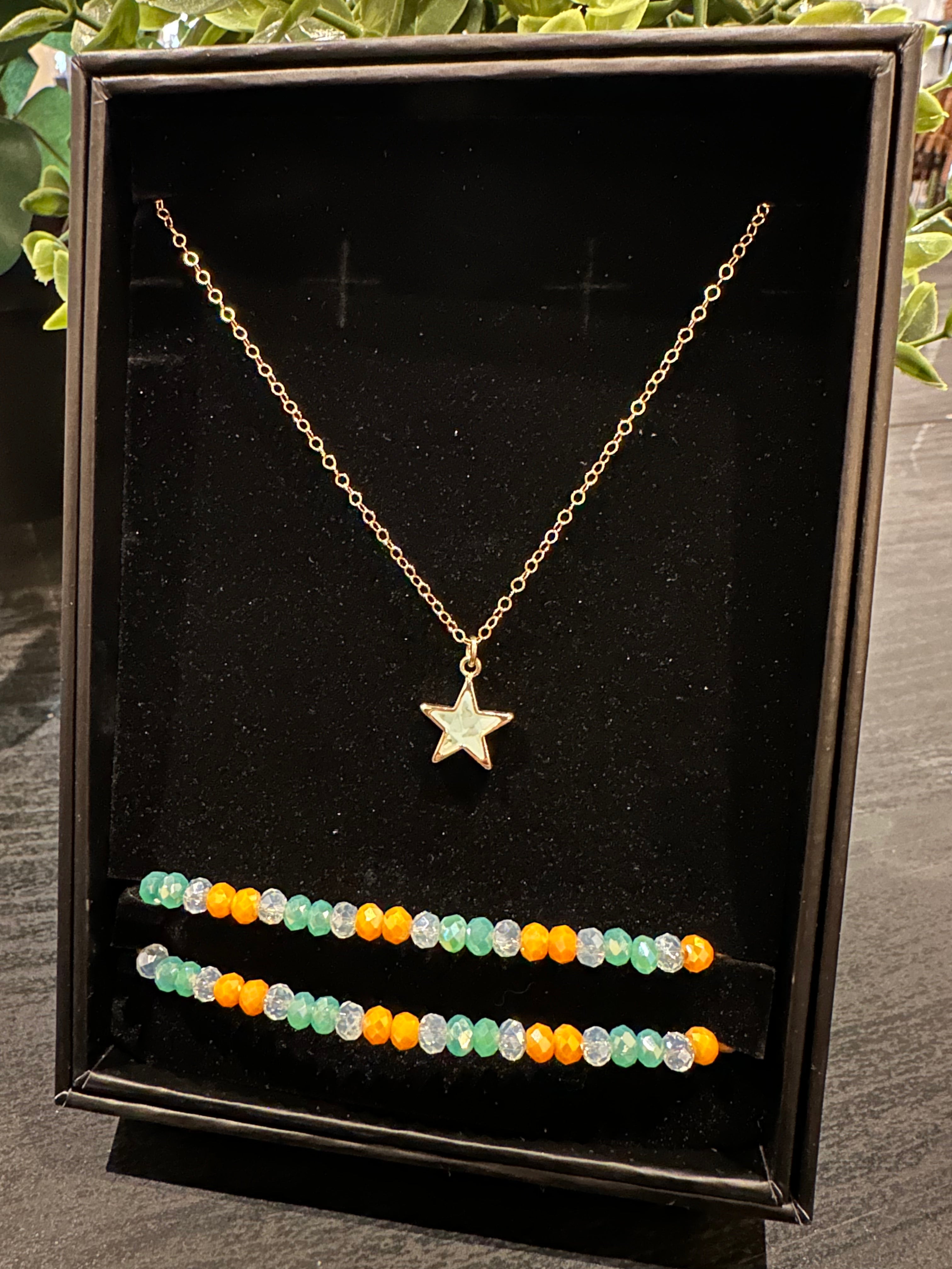 Celebrate the glamour and allure of the stage with the Kitty Star Set. A radiant star necklace takes center stage, capturing the essence of classic showgirl elegance, while two beautifully beaded bracelets complete the look. This set delivers show-stopping, contemporary style with playful sophistication.