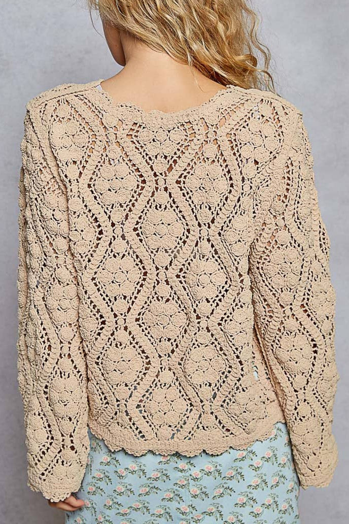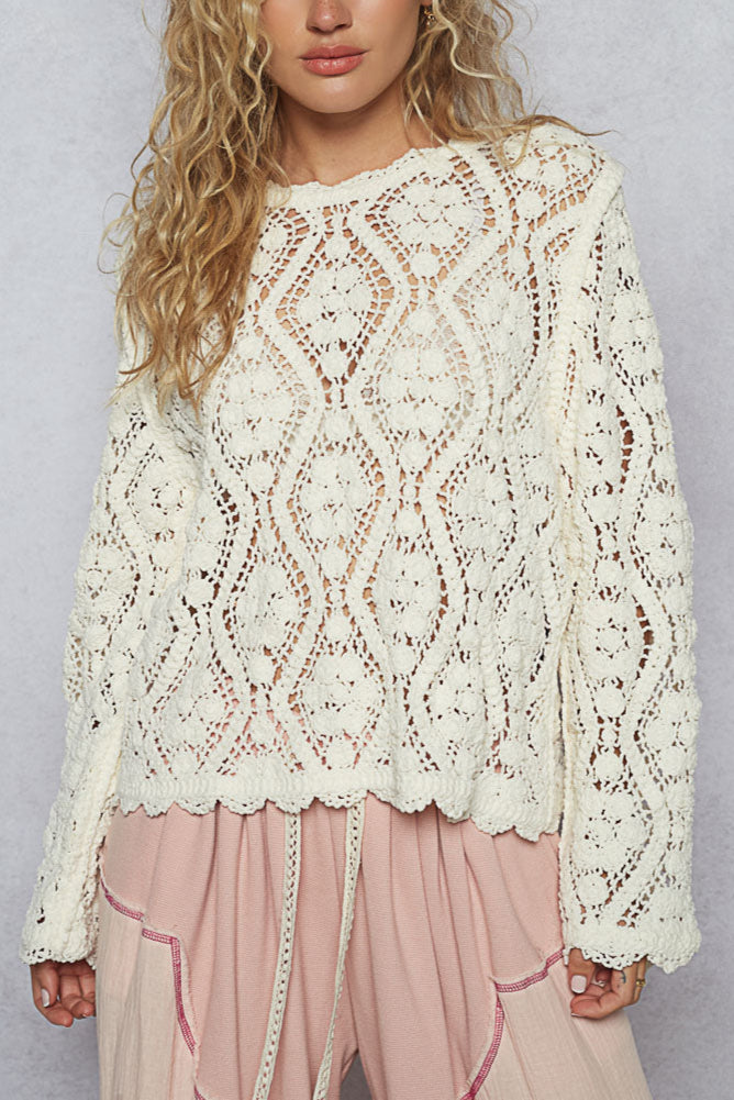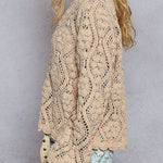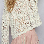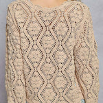 Stay cozy and stylish in the Lily Open Knitted Crochet Sweater. Featuring a playful round neck and long sleeves, this stone-washed solid color sweater adds a fun twist to your knitwear collection. Perfect for layering or wearing on its own, it brings a light, breezy vibe to any outfit.