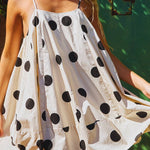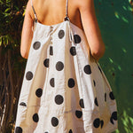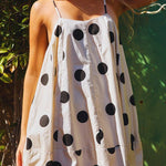 The Lorelai Tie Strap Trapeze Stretch Mini Dress combines a charming polka dot print with self tie straps for a customizable fit. Its button-up back and pull-on design make dressing simple, while the fully lined fabric ensures comfort. The loose, voluminous silhouette offers ease of movement and a flattering shape, perfect for everyday wear or special occasions.