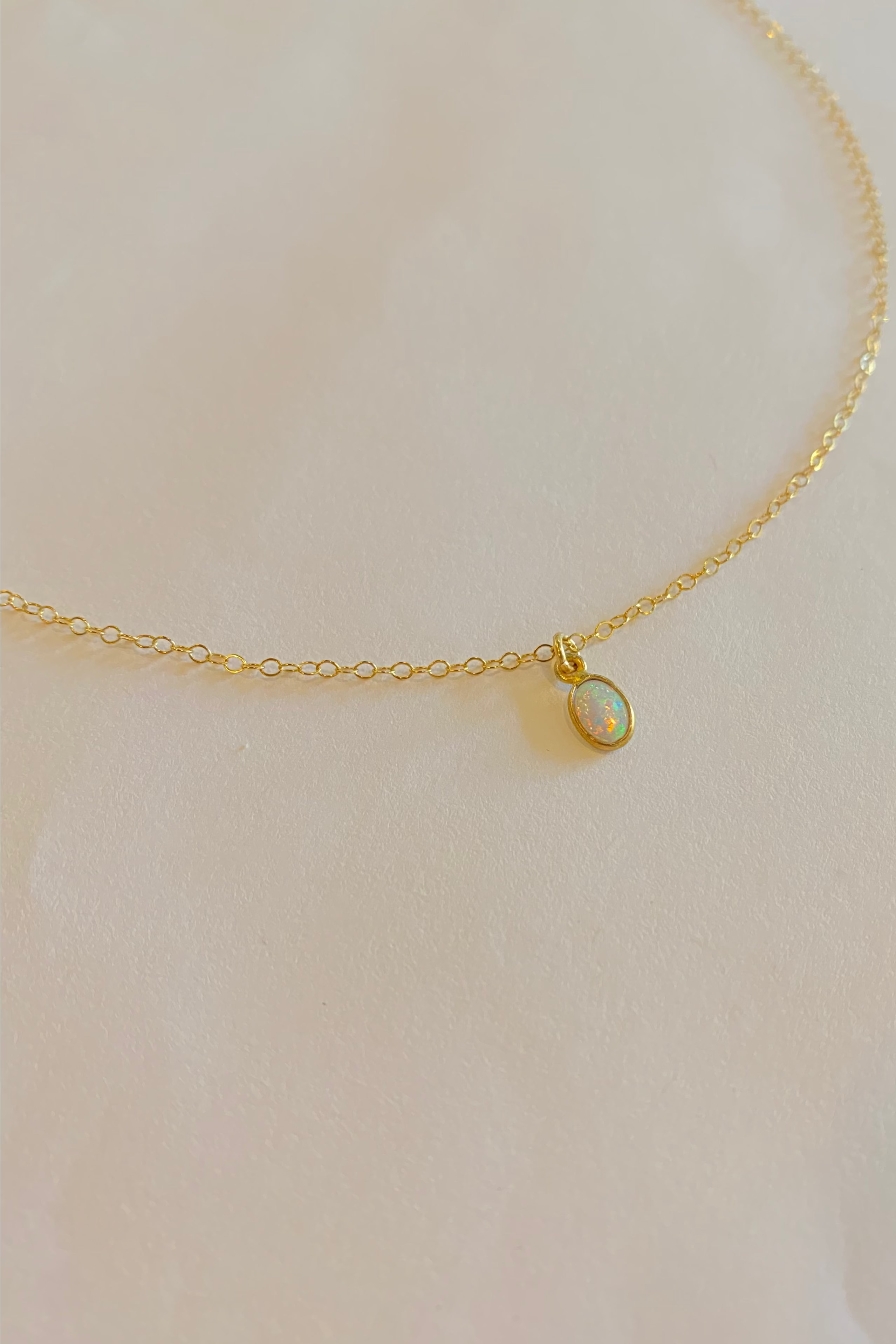 This elegant necklace features a 14k gold-filled oval pendant adorned with a shimmering lab-created opal. Suspended on a 16" chain, it offers a perfect balance of delicate style and everyday wearability. The lab opal adds a subtle play of color, making this piece an ideal choice for those seeking a meaningful accessory that combines beauty with durability.