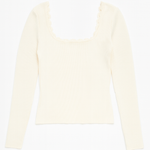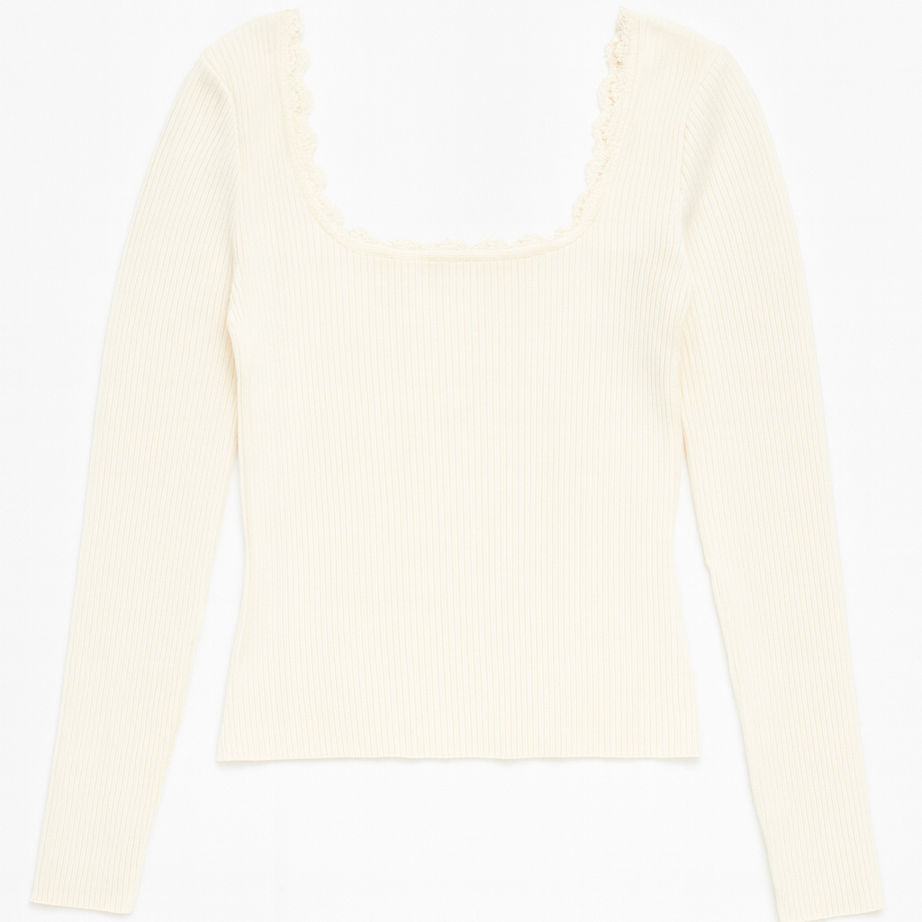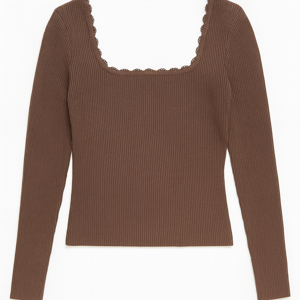 The square neckline framed by delicate lace trim adds a subtle romantic touch while keeping the overall look modern and clean. Long sleeves and a smooth, lightweight texture make it perfect for layering or wearing on its own through every season.