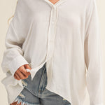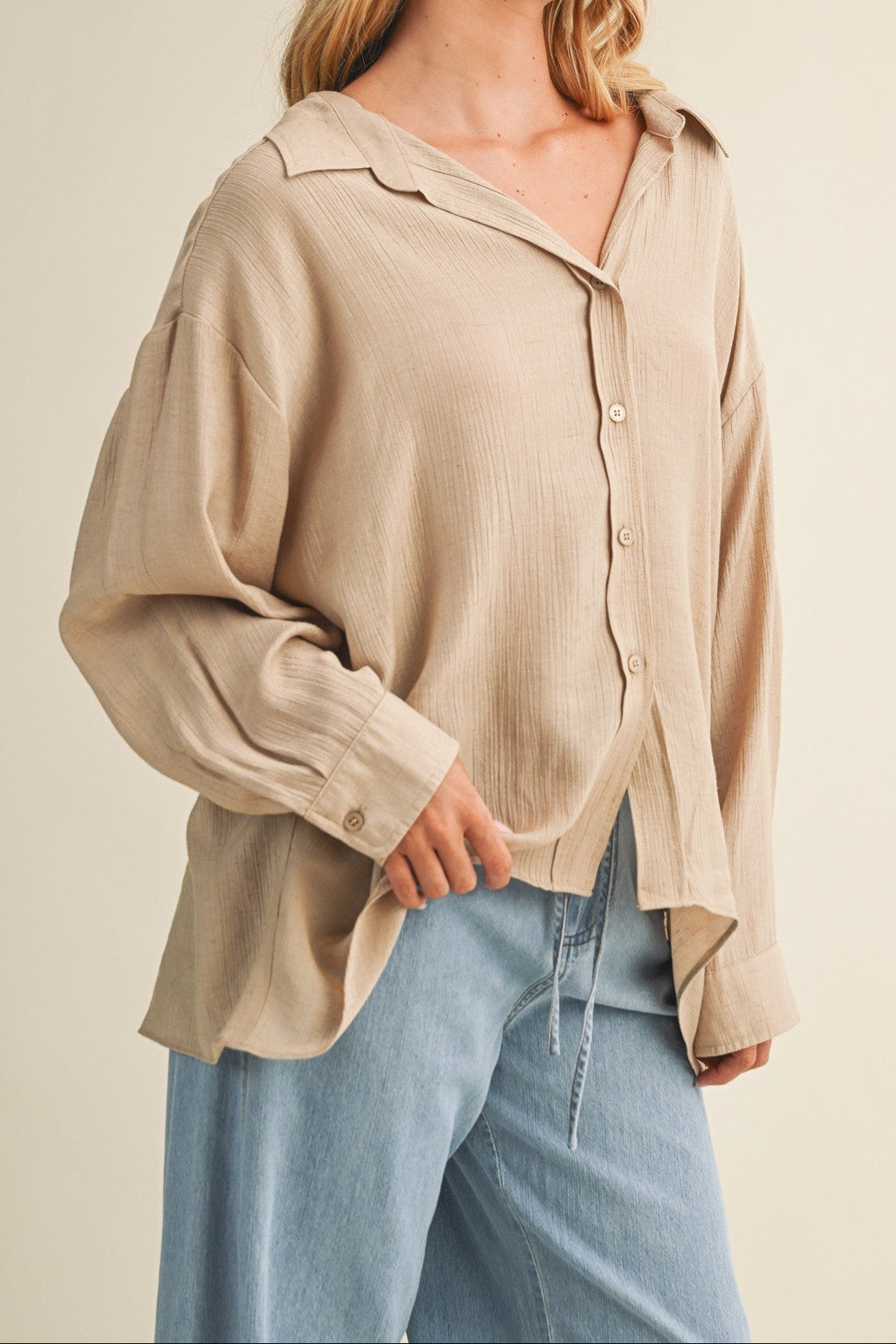 The Nora Crinkled Slub Button-Down Shirt effortlessly transitions from office to weekend. Its textured crinkled fabric brings casual comfort while the classic button-down silhouette keeps things polished. Layer it over a tee for relaxed days or wear it solo for a more refined look. Versatile enough to pair with tailored trousers or your favorite jeans, this wardrobe essential adapts to your style and schedule.