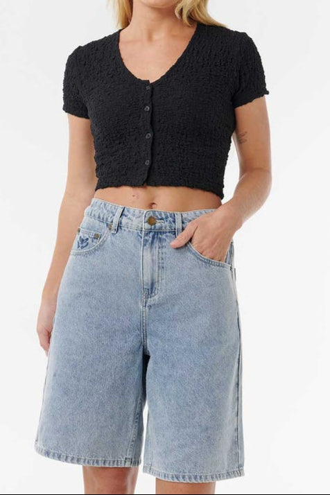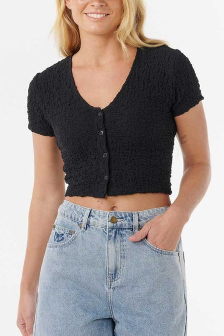 The Sunset Luau Textured Tee brings a playful vibe to your everyday look with its clean, fitted silhouette and soft textured cotton blend. Featuring a handy button closure and a subtle metal logo trim, this tee is your go-to for effortless style you’ll want to wear all day long.