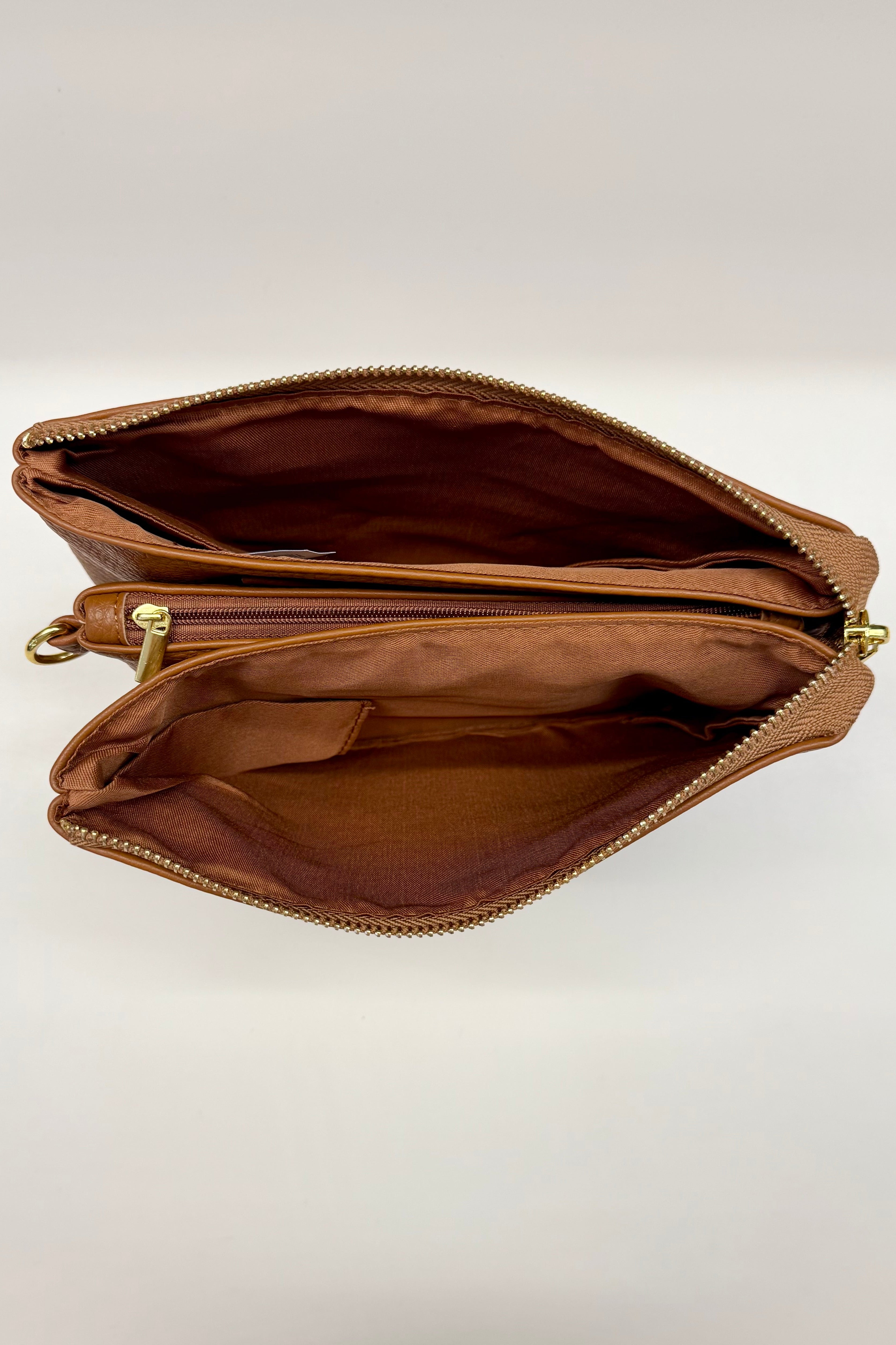 The Tina Crossbody/Wristlet offers versatile styling with dual carrying options. Three zippered pockets keep your essentials secure, while two card slots provide quick access to what you need most. Switch between the included long crossbody strap for hands-free convenience or the short wristlet strap for compact carrying. Whether you're running errands or heading out for the evening, this adaptable bag moves with your lifestyle.