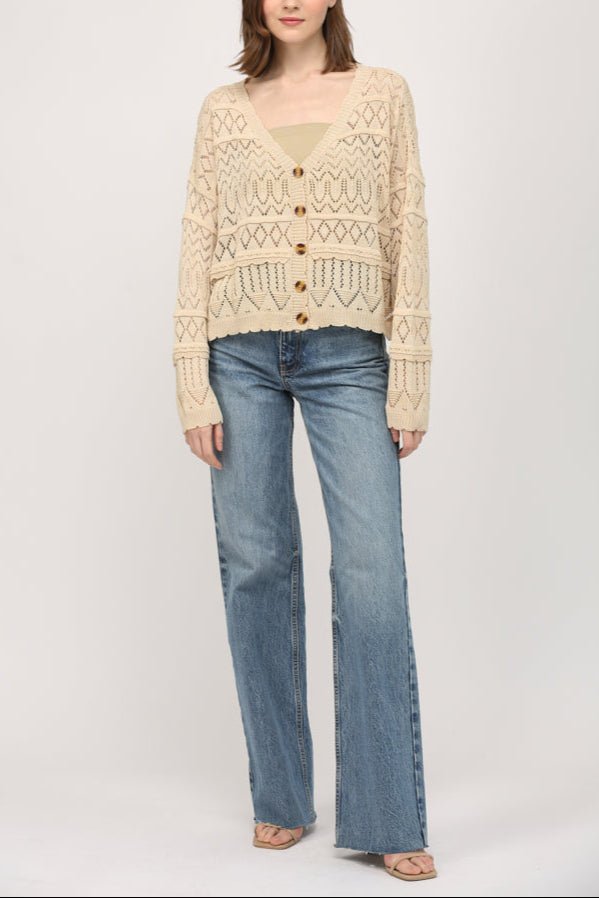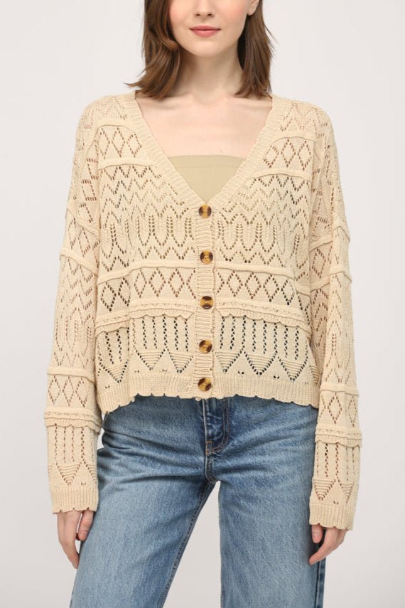 The Twyla Button Down Crochet Knit Cardigan is a cozy and charming choice for fall. Its delicate crochet knit design pairs perfectly with jeans and boots, creating a warm and stylish look for cooler days. This cardigan offers both comfort and a touch of seasonal charm to your wardrobe.