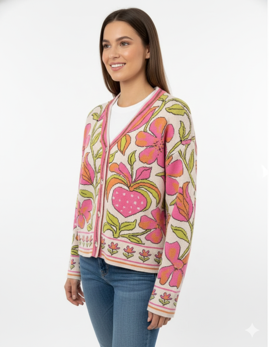This cardigan is an instant mood-lifter. The bold floral pattern mixed with the soft neutral base gives it that vintage-inspired, boutique feel we all love — colorful without being overwhelming.
